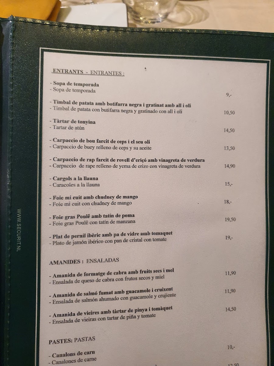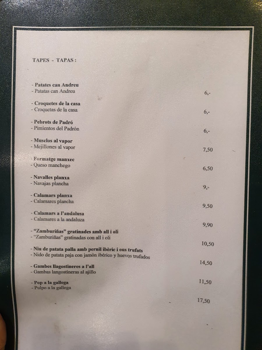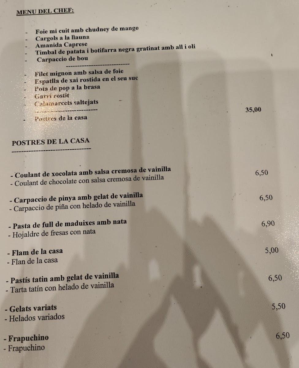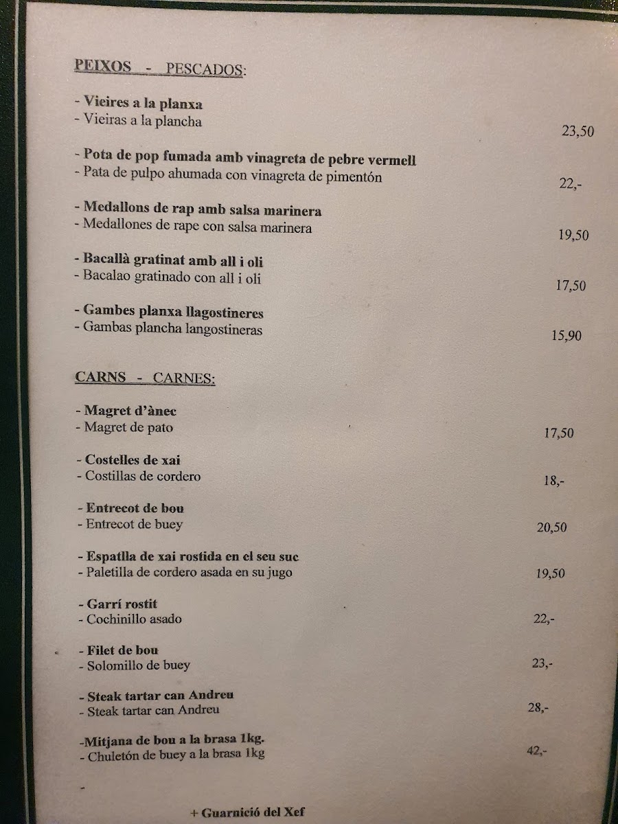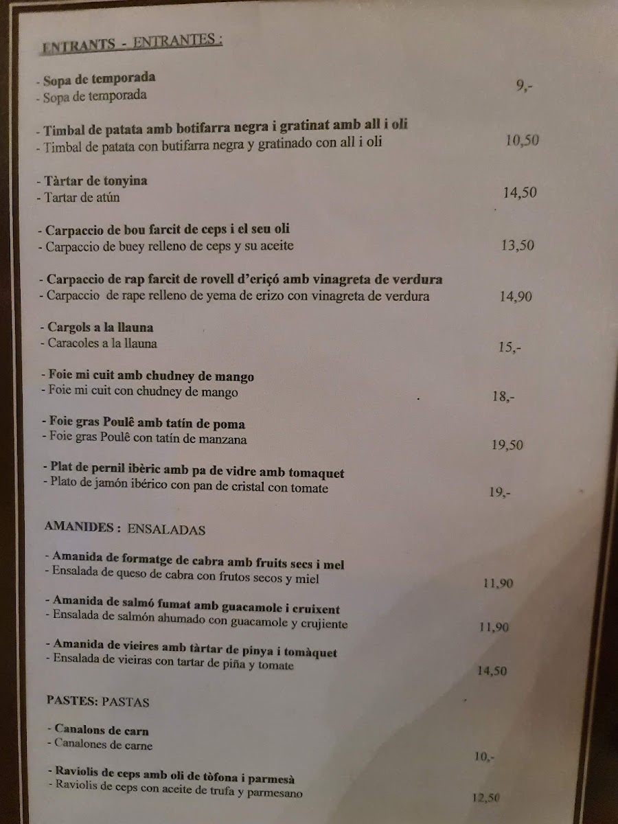 Typical highlights include rich, satisfying options like escargot and cochinillo, alongside fresh seafood such as gambes vermelles de Palamós or salmó salvatge maridat. The menu also features comforting grilled meats like chuletón and lamb, complemented by seasonal specialties and traditional Catalan accompaniments. Pair your meal with carefully chosen Catalonian wines, cava, or other local drinks to round out the experience.